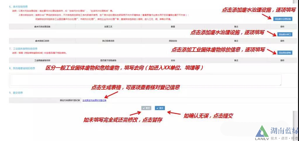3.6、按以上要求填報完全后,若仍有不確定,需要修改的地方,可點擊最下方“保存”;若填報無誤,點擊最下方“提交”即可。填報完成后,系統(tǒng)自動生成固定污染源排污登記表表格(如附件1)