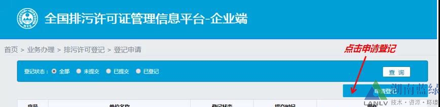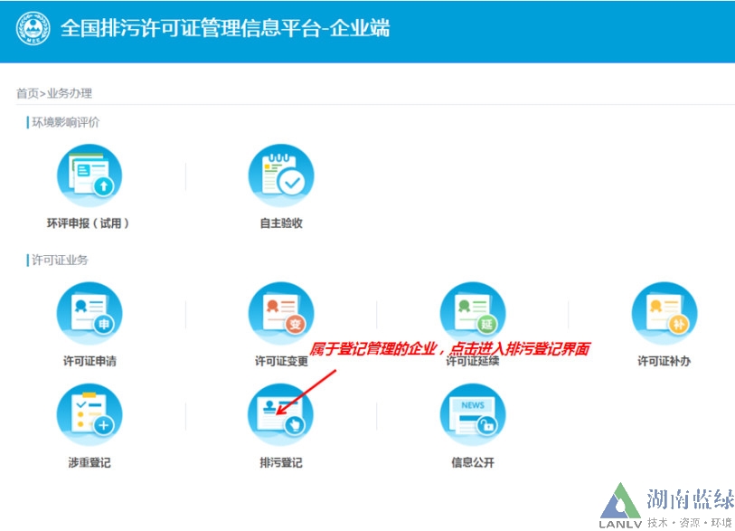 3.2、以登記管理為例,點擊“排污登記” 后。