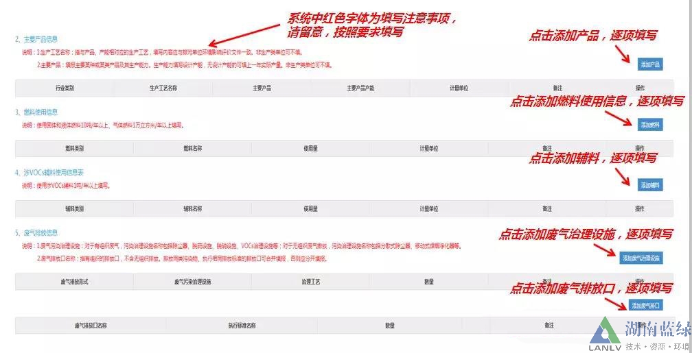 3.5、填寫主要產(chǎn)品信息、燃料使用信息、涉VOCs輔料使用信息表、廢氣排放信息、廢水排放信息、工業(yè)固體廢物排放信息、其它需要說明的信息。排污單位根據(jù)實際情況填寫,按要求填報。